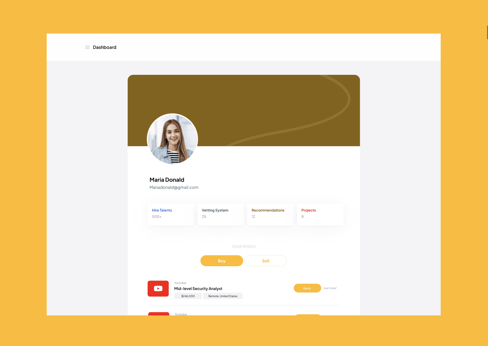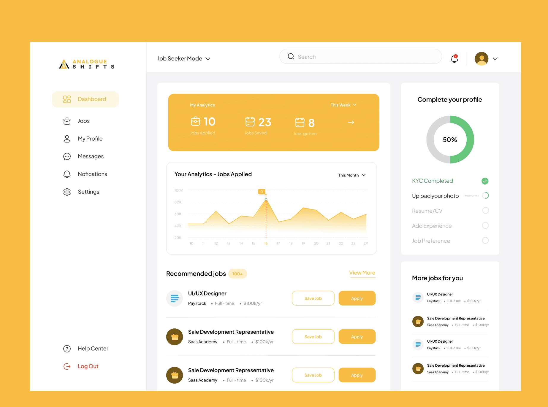 For the dashboard, I redesigned the layout to feel more structured and readable, helping users quickly see their applications, jobs, and activity.