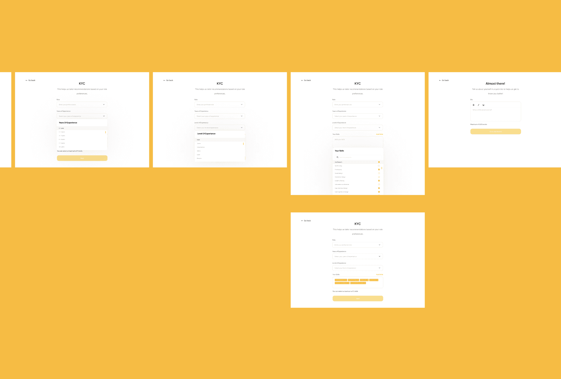 For onboarding, I worked on spacing, flow, and guidance so new users could move through the process with less friction.
